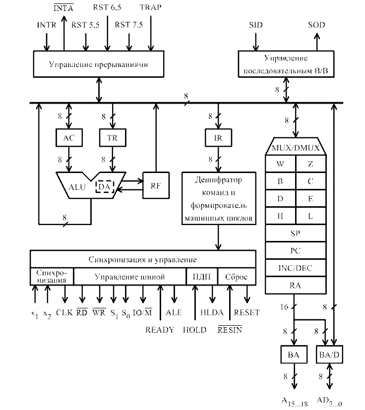 Блок синхронизации и управления использует выход дешифратора команд и шифратора машинных циклов для синхронизации циклов, генерации сигналов состояния и управления шиной (внешними устройствами микропроцессорной системы).