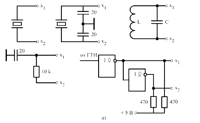 Выводы x1 и x2 (рисунок 8), предназначенные для создания совместно с внутренними элементами МП генератора тактовых импульсов, могут быть использованы различными способами (рисунок 9, а). Кварц может быть подключен непосредственно к выводам x1 и x2 как единственный частотно-задающий элемент. Если частота генератора составляет 4 МГц или более, могут понадобиться конденсаторы с рекомендованной емкостью 20 пФ для надежного запуска генератора. Параллельный LC-контур также может быть подключен непосредственно к выводам x1 и x2. При невысоких требованиях к стабильности частоты можно использовать частотнозадающую RC-цепочку. Возможна синхронизация от внешнего генератора ГТИ. При этом рекомендуется включать внешние логические элементы с открытым коллектором, причем при частоте генерации более 6 МГц включаются два логических элемента.