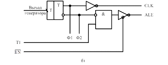 Для образования сигналов синхронизации CLK выход генератора подается на вход T-триггера (рисунок 9, б). Триггер формирует две последовательности противофазных импульсов Ф1 и Ф2 для тактирования внутренних схем МП. Сигнал синхронизации системы CLK синфазен импульсам Ф2. Сигнал ALE формируется как один импульс последовательности Ф1, выделяемый из нее в первом такте (Т1) каждого машинного цикла. Буфер выдачи сигнала ALE во внешние цепи имеет вход разрешения