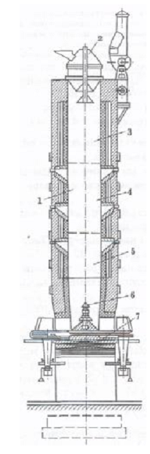 Рис.3.1. Шахтная печь для обжига извести:1 — шахта; 2 — загрузочное устройство; 3 — зона подогрева; 4 — зона обжига;5 — зона охлаждения; 6 — гребень для подачи воздуха; 7 — механизм выгрузки обожженной извести.
