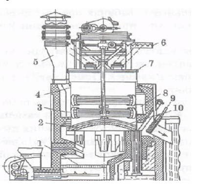 Рис.3.2 Гипсоварочный котел: 1 - топка; 2 - сферическое днище; 3 - жаровые трубы; 4 - стальной барабан; 5 - дымовая труба; 6 - винтовой конвейер; 7- крышка;8 - кольцевые каналы; 9 - шибер; 10 – мешалка