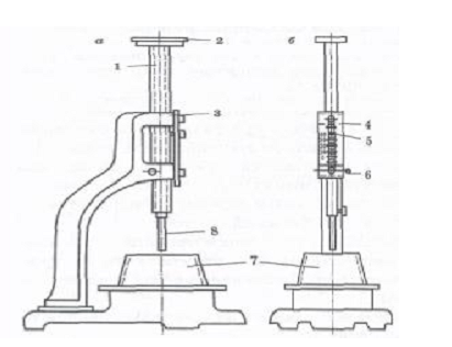 Рис. 3.5. Прибор Вика: а — вид сбоку; 6 — вид спереди; 1 — стержень с грузом; 2 — дополнительный груз; 3 — обойма; 4 — шкала; 5 — указатель;6 — зажимный винт; 7 — кольцо для цементного теста; 8 — пестик