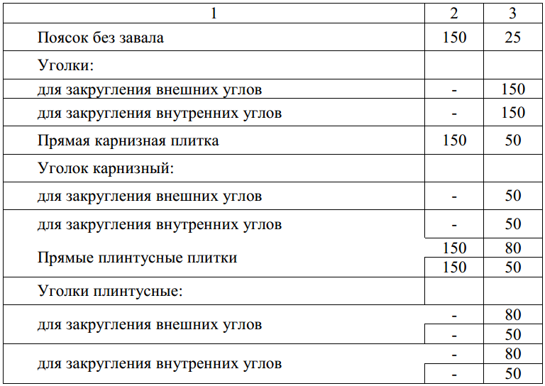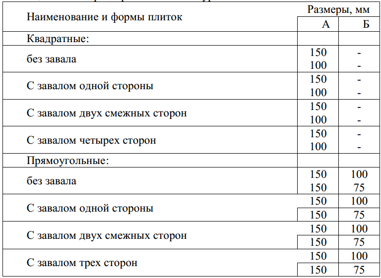Керамические глазурованные плитки (ГОСТ 6141-91) изготовляют 28 типоразмеров (размеры приведены в таблице 2). Отклонения размеров по длине граней не должны превышать 1,5 мм. В каждой партии должны быть плитки только с плюсовыми либо только с минусовыми отклонениями.