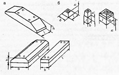 Сборные железобетонные элементы фундаментов: а — плиты ленточных фундаментов; б — башмаки столбчатых фундаментов