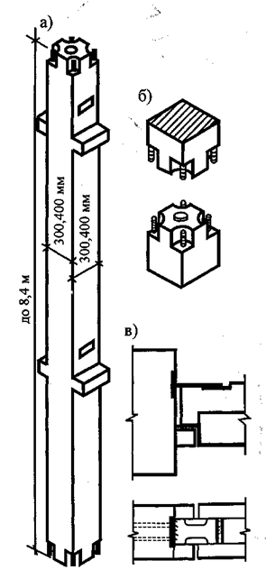 Колонна каркаса многоэтажных зданий: а – общий вид колонны длиной на два этажа; б – стык элементов; в – стык колонны с ригелем