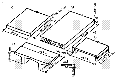Плиты перекрытия многоэтажных зданий: а – плита сплошного сечения; б – многопустотная плита; в – ребристая плита; г – плита 2Т