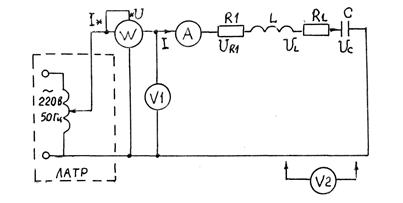 Схема экспериментальной установки для исследования электрической цепи с последовательным соединением элементов R, L, C представлена на рис.4.8.