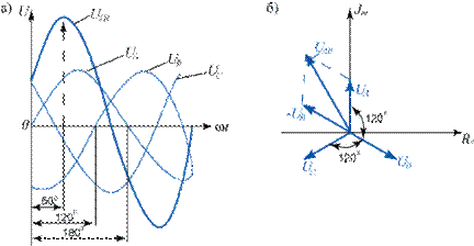 рис.8.2. Графики а) и векторная диаграмма б) фазных и одного линейного напряжения