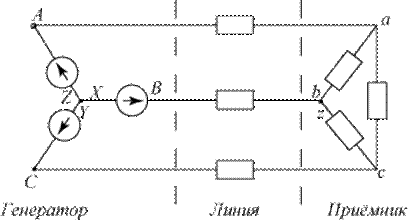 Трёхпроводная линия соединяет начала соответствующих фаз источника и приёмника (A – a, B – b, C – c).