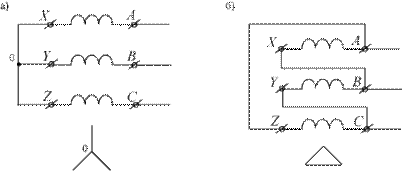Практически используются две схемы симметричных соединений трёх фаз: звезда (рис.8.3а), когда соединяются вместе концы всех обмоток X, Y, Z, и треугольник (рис.8.3б), когда соединяются начало одной обмотки с концом другой в последовательности A – Z, B – X, C – Y.