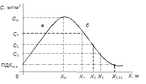 По найденным в ходе расчета точкам строится график С = f (X). Затем на ось ординат наносится значение максимально разовой предельно допустимой концентрации вещества ПДКм.р. (Таблица 10) и из этой точки параллельно оси абцисс проводится прямая до пересечения с ветвью б графика (см. Рисунок). Из точки пересечения опускается перпендикуляр на ось Х. Полученное таким образом значение Х СЗЗ и будет являться размером санитарно-защитной зоны предприятия.