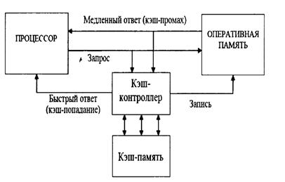 Кэш (англ. cache, от фр. cacher «прятать», т.е. «скрытая» память) — промежуточный буфер с быстрым доступом, содержащий информацию, которая может быть запрошена с наибольшей вероятностью. Предназначен Кэш для ускорения обращения к данным, содержащимся постоянно в памяти с меньшей скоростью доступа. Таким образом, Кэш выступает в роли буфера, сглаживающего различие при взаимодействии в быстродействии высокоскоростного и медленного (в сравнении с высокоскоростным) устройств. Наличие такого буфера позволяет уменьшить время простоев (состояние ожидания) более быстрого устройства. Состав Кэш и принципы функционирования представлены на рис. 1.