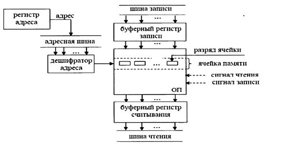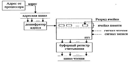 Двоичный код адреса по шине адреса поступает на дешифратор адреса и возбуждает линию, идущую к выбранной ячейке памяти. При операции чтения эта линия открывает вентили, обеспечивающие передачу значения, хранящегося в каждом разряде выбранной ячейки, в соответствующий разряд буферного регистра считывания. При записи в ячейку памяти направление потока разрядной информации меняется на противоположное.