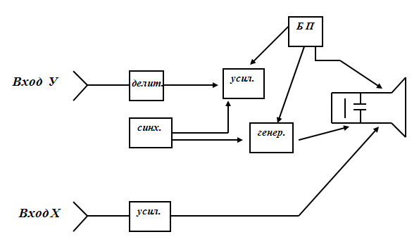 Измерительный прибор для визуального наблюдения и регистрации в электрические сигналы, особенно в быстро протекающих процессах. Осциллограф состоит из электрических блоков: