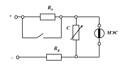 Последовательная схема содержит источник питания, регулировочный реостат и добавочное сопротивление резистора ЭМС. Сопротивление включено последовательно к источнику питания, а регулировочный реостат подключается параллельно измерителю.