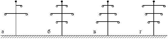 При выборе типа опоры необходимо наметить желаемое расположение проводов на опоре. С точки зрения электрических процессов в ВЛ провода желательно располагать симметрично в углах равностороннего треугольника. Но на практике при таком расположении вероятно схлестывание проводов, закрепленных в гирляндах подвесных изоляторов. Удобно использовать опоры портального типа с горизонтальным расположением проводов в одной плоскости, но эти опоры дороги. Поэтому наиболее распространенным является размещение проводов в углах неравностороннего треугольника на одноцепных опорах (рис. 2.2а) и на двуцепных – в виде «бочки» (рис. 2.2б), «прямой елки» (рис. 2.2в), «обратной елки» (рис. 2.2г). В особых районах по гололеду и районах с частой пляской проводов, а также на ВЛ 500 кВ и выше провода располагают горизонтально.