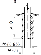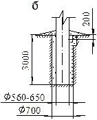 Установка стоек опор выполняется в котловане, образованном буровой машиной, диаметр бура которых на 5–7 см превышает диаметр стойки, с засыпкой и плотной трамбовкой пазух между стенками котлована и поверхностью стойки. Такая установка применяется для ненарушенных грунтов, обладающих достаточно высокими механическими характеристиками (рис. 9.1а). Для усиления заделки при слабом или нарушенном грунте применяют дополнительно один (рис. 9.1б) или два ригеля, закрепляемых на стойке в верхней части котлована. Ригель размещается в специально выполненной узкой щели и, как стойка, опирается на грунт с ненарушенной структурой. При наличии грунтовых вод, сыпучих песков или грунта с большим содержанием гальки и валунов образовать котлован буровой машиной не удается, и его вскрывают экскаватором (рис. 9.1в). Тогда опора закрепляется в засыпном грунте, т.е. грунте с нарушенной структурой, имеющем сниженные механические характеристики. Здесь для усиления заделки опор ригели устанавливаются и в нижней части стойки. Если под слоем сухого грунта находится обводненный грунт, то заглубление нецелесообразно, в таких случаях глубину заделки компенсируют устройством насыпной банкетки соответствующей высоты (рис. 9.1г). Опоры анкерно-углового типа также устанавливают непосредственно в грунт в наклонные или прямые котлованы.
