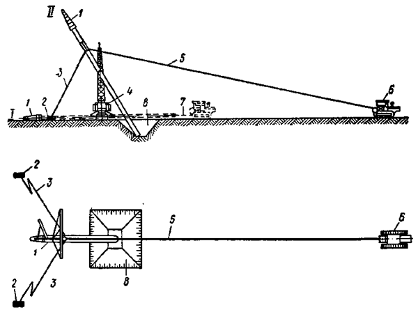 Собранную опору 1 выкладывают по оси линии над вырытым котлованом 8 так, чтобы низ стойки находился на расстоянии 1,5-2 м от бровки котлована (положение I). Кран 4 устанавливают поперек линии на аутригеры на расстоянии 1 м от края котлована. Под нижней траверсой опоры крепят две боковые расчалки 3 из троса длиной 50 м и разводят их к двум ручным лебедкам 2.