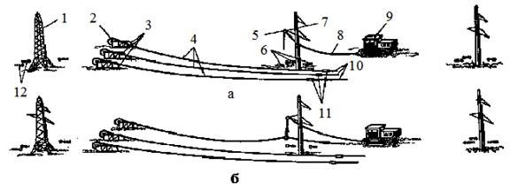 После установки опор и проверки готовности трассы к монтажу выполняются монтажные работы по установке гирлянд изоляторов, арматуры и по подвеске проводов. Гирлянды изоляторов собирают на земле и очень аккуратно перемещают к месту подъема на опору. Далее выполняется раскатка провода. Чаще всего раскатка выполняется с неподвижных раскаточных устройств, установленных в начале анкерного участка, т.е. способом волочения. Раскатку способом волочения совмещают с подъемом проводов и тросов на промежуточные опоры. Тогда провода и тросы не тянутся по земле, а касаются ее лишь в серединах пролетов и поэтому не повреждается их поверхность. Процесс раскатки провода и его подъема на одноцепную опору методом волочения показан на рис. 10.3. Заключается он в следующем. Барабаны с проводом устанавливают, не доходя 10-15 м от опоры, с которой начинается монтаж, с каждого из них вручную отматывают 15-25 м провода и на его конце устанавливают монтажный клиновой зажим, трос которого прикрепляют к трактору. Трактор проходит промежуточную опору и останавливается. Провод от него отцепляют и раскладывают на земле вдоль трассы для подъема на опору. На опоре устанавливают блок 5 и пропускают через него такелажный трос 8, прикрепленный к трактору. Затем провод закладывают в монтажный ролик, прикрепленный к нижнему изолятору гирлянды 6, поднимают с помощью трактора гирлянду на опору, закрепляют ее на траверсе.