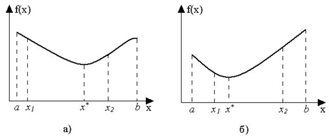 Фактически все одномерные методы поиска основаны на предположении, что исследуемая функция обладает свойством унимодальности, по крайней мере, в допустимой области. Это позволяет определить, в каком из задуманных двумя точками подынтервалов точка оптимума отсутствует.
