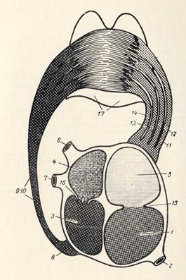 1 — левый желудочек (расширен); 2 — аорта; 3 — правый желудочек (расширен); 4 — правое предсердие; 5 — левое предсердие (расширено); 6 — верхняя полая вена; 7 — нижняя полая вена; 8 — артериальный конус; 9, 10 — правая и левая ветви легочной артерии; 11—14 — легочные вены; 15 — остатки двустворчатого клапана; 16 — трехстворчатый клапан; 17 — л егкие.