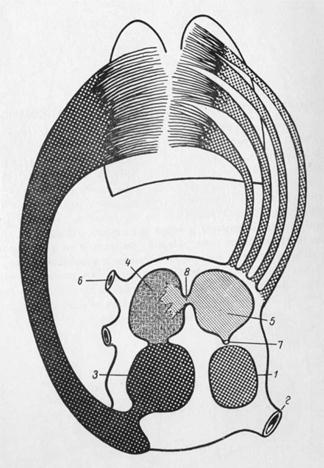 1 — левый желудочек (гипопластичен); 2 — аорта (узка); 3— правый желудочек (резко увеличен); 4 — правое предсердие (увеличено); 5 —левое предсердие (увеличено); 6 —верхняя полая вена; 7 — митральное отверстие (сужено); 8 — дефект межпредсердной перегородки.