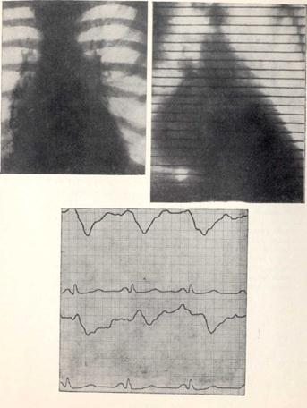 Гиперволемия («вишни» в корнях), выбухание II сердечной дуги слева. В косых проекциях увеличение преимущественно правых камер сердца и гипопластичная аорта. Электрокимографические кривые с левого (вверху) и правого (внизу) предсердия: волна «шунта» на кривой правого предсердия в пресистоле и начале систолы, соответственно которой на кривой левого предсердия — углубленное пресистолическое снижение кривой.