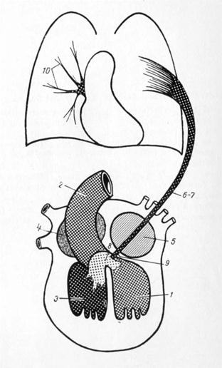 1 — левый желудочек; 2 — аорта; 3 — правый желудочек (увеличен, гипертрофирован); 4 — правое предсердие (увеличено); 5 — левое предсердие; 6, 7 — легочные артерии (узки); 8 — дефект межжелудочковой перегородки;.9 — сужение легочной артерии; 10 — легочный рисунок (обеднен).