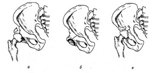 а - края вертлужной впадины с вывихом бедра кзади (могут быть и без вывиха), б - перелом дна вертлужной впадины без смещения отломков, в - перелом дна вертлужной впадины с центральным вывихом бедра.
