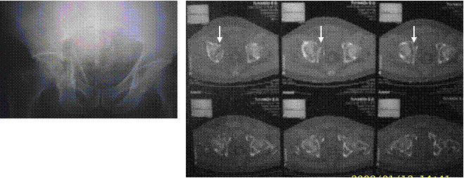 Рис.9. Перелом дна вертлужной впадины со смещением отломков: рентгенография и компьютерная томография.