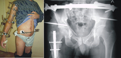 При оперативном лечении на проведенных в кости таза стержнях монтируют аппарат, с помощью которого выполняют репозицию (рис.12). По достижении репозиции аппарат переводят в режим стабилизации сроком на 5 – 6 нед. Трудоспособность восстанавливается через 10–12 нед.