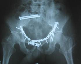 Рис.15. Рентгенография остеосинтеза винтами и реконструктивными пластинами по поводу разрыва крестцово-подвздошного сочленения справа, разрыва лонного симфиза, перелома дна вертлужной впадины с обеих сторон.