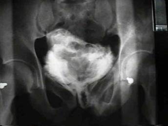 Ретроградная цистография. В данном методе используют контрастное вещество, вводимое в мочевой пузырь ретроградно по катетеру. Для этого после установки мочевого катетера, разводят контрастное вещество в 300мл физ.р-ра, фурацилина или др., которое вводят в мочевой пузырь. Накладывают зажим. Производят обзорные рентген снимки костей таза в прямой и под углом 45 градусов проекциях (рис.16). При целом мочевом пузыре на цистограмме его контур равный, без деформаций, в виде шара. При разрыве - контур неровный, имеются его деформации, затеки контрастного вещества (рис. 17). Метод является достоверным.