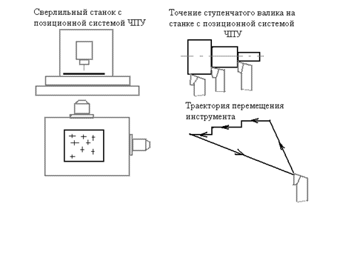 При позиционном (рис.5.6) программируется только конечное положение рабочих органов системы, а траектория их перемещения не программируется и обеспечивается конструкцией системы. Скорость же перемещения обычно максимально возможная, по конструктивным ограничениям, или задается постоянной.