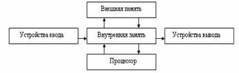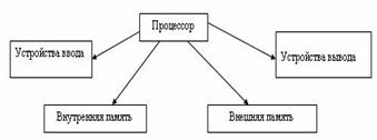 Здесь стрелка обозначает направление управляющего воздействия. Смысл схемы заключается в том, что процессор управляет работой всех остальных устройств компьютера.