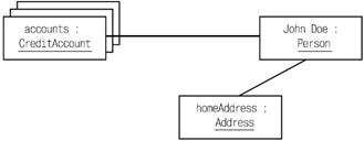 Объекты изображают прямоугольниками с идентификаторами ролей объектов и типами. Однородные коллекции объектов могут изображаться накладывающимися друг на друга прямоугольниками. Такие диаграммы используются довольно редко.