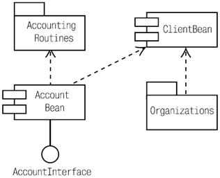 Диаграммы компонентов представляют компоненты системы с точки зрения ее сборки, конфигурационного управления и развертывания. Компоненты сборки и конфигурационного управления обычно представляют собой файлы с исходным кодом, динамически подгружаемые библиотеки, HTML-странички и пр., компоненты развертывания — это компоненты JavaBeans, CORBA, COM и т.д. Компонент изображается в виде прямоугольника с несколькими прямоугольными или другой формы «зубами» на левой стороне. Связи, показывающие зависимости между компонентами, изображаются пунктирными стрелками. Один компонент зависит от другого, если он не может быть использован в отсутствии этого другого компонента в конфигурации системы. Компоненты могут также реализовывать интерфейсы. Диаграммы этого вида используются редко.