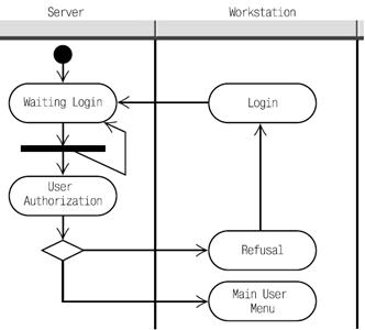 Диаграммы деятельности иллюстрируют набор процессов-деятельностей и потоки данных между ними, а также возможные их синхронизации друг с другом. Деятельность изображают в виде прямоугольника с закругленными сторонами, помеченного слева и справа именем деятельности.
