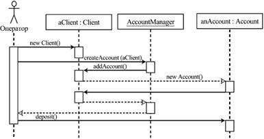 Диаграммы сценариев (или диаграммы последовательности) показывают возможные сценарии обмена сообщениями или вызовами во времени между различными компонентами. Компоненты, участвующие во взаимодействии, изображают прямоугольниками вверху диаграммы. От каждого компонента вниз идет вертикальная линия, называемая его линией жизни. Считается, что ось времени направлена вертикально вниз. Интервалы времени, в которые компонент активен, то есть управление находится в одной из его операций, представлены тонким прямоугольником, для которого линия жизни компонента является осью симметрии. Передачу сообщения или вызов изображают стрелкой от компонента-источника к компоненту-приемнику. Возврат управления показан пунктирной стрелкой, обратной к соответствующему вызову. Эти диаграммы используются достаточно часто, например, при детализации сценариев, входящих в варианты использования.