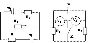 =200 В. Найдите показания вольтметров в случаях: а) ключ К разомкнут, б) ключ К замкнут. Внутренним сопротивлением источника пренебречь. [а) U1=120 В, U2=80 В; б) U1=U2=100 В].