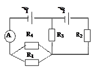 = 100 В, R1= 20 Ом, R2= 10 Ом, R3= 40 Ом, R4= 30 Ом. Найдите показание амперметра. Внутренним сопротивлением источников и амперметра пренебречь. [1 А].