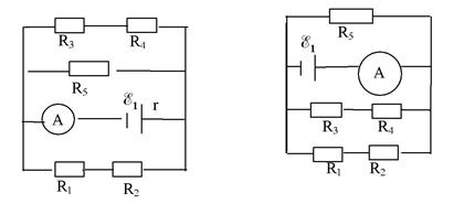 2.39. Найдите показания амперметра в схеме на рис. 2.14, если ЭДС равна 19,8 В, внутреннее сопротивление 0,4 Ом, R1=30 Ом, R2=24 Ом, R3=50 Ом, R4=40 Ом, R5=60 Ом.