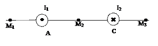 3.1. На рис. 3.1 изображено сечение двух прямолинейных бесконечно длинных проводников с током. Расстояние АС между проводниками равно 10 см, I1=20 А, I2 = 30 А. Найдите магнитную индукцию поля, вызванного токами I1 и I2 в точках М1, М2 и М3. Расстояния М1А=2 см, АМ2 =4 см и СМ3 =3см. [0,15мТл; 0,20 мТл; 0,17 мТл].