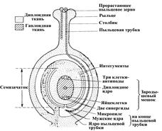 При оплодотворении пыльцевое зерно, попав на рыльце пестика, прорастает по направлению к семязачаткам за счет вегетативной клетки, образующей пыльцевую трубку. На конце пыльцевой трубки генеративная клетка образует 2 спермия. Проникая в зародышевый мешок через микропиле (пыльцевход), один спермий (n) оплодотворяет яйцеклетку (n), а второй (n) – центральную клетку (2n).