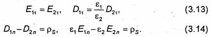 на границе раздела двух диэлектриков непрерывны (не разрываются), а модуль D одинаков в различных средах. Эти условия имеют вид:
