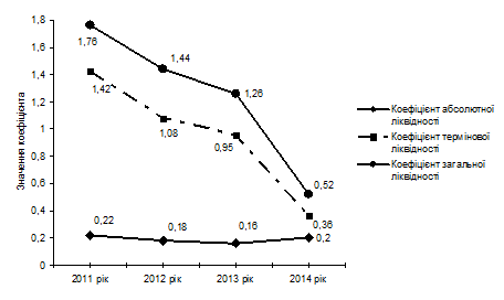 Рисунок 1 – Динаміка показників ліквідності ТОВ «Мрія» за 2011-2014 рр. (на кінець року)
