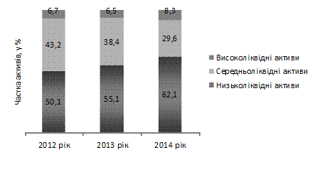Рисунок 3 – Структура оборотних активів ТОВ «Мрія» за рівнем ліквідності у 2012-2014 рр. (на кінець року)