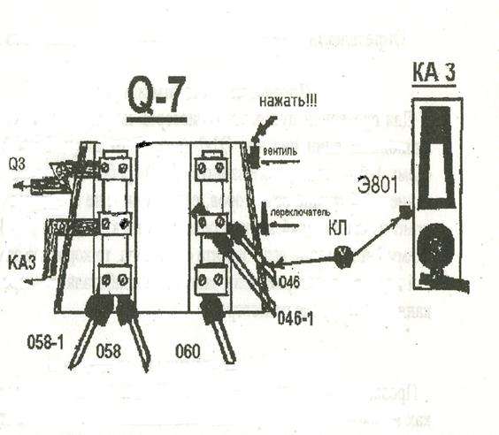 После проверки контрольной лампы её второй конец подсоединяем на кабель 046, подключенный к контакторному элементу отключателя ТЭД Q7. Лампа должна загореться. Вручную или нажатием на грибок вентиля привода отключателя Q7 переводим его в аварийный режим (вал отключателя с кулачками, а не "лысый"). Погасание лампы свидетельствует об отсутствии к.з. в цепи 1-2 ТЭД, т.е. в силовой цепи от контакторного элемента Q7-1 до Q7-2.