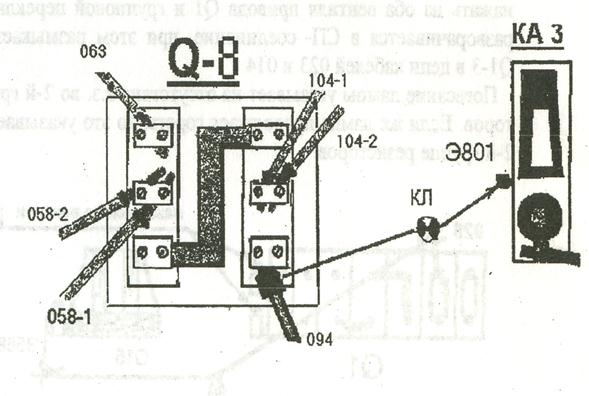 После проверки контрольной лампы её второй конец подсоединяем на кабель 094, подключенный к контакторному элементу отключателя ТЭД Q8. Лампа должна загореться. Вручную или нажатием на грибок вентиля привода отключателя Q8 переводим его в аварийный режим (вал отключателя с кулачками, а не "лысый"). Погасание лампы свидетельствует об отсутствии к.з. в цепи 3-4 ТЭД, т.е. в силовой цепи от контакторного элемента Q8-1 до Q8-2.