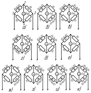 Если принять чувствительность моста с одним рабочим датчиком за исходную единицу, то чувствительность всех других мостовых схем можно выразить: